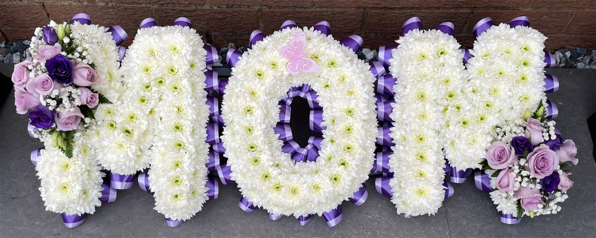 Massed letters of white chrysanthemums with pleated ribbon edge and rose sprays.